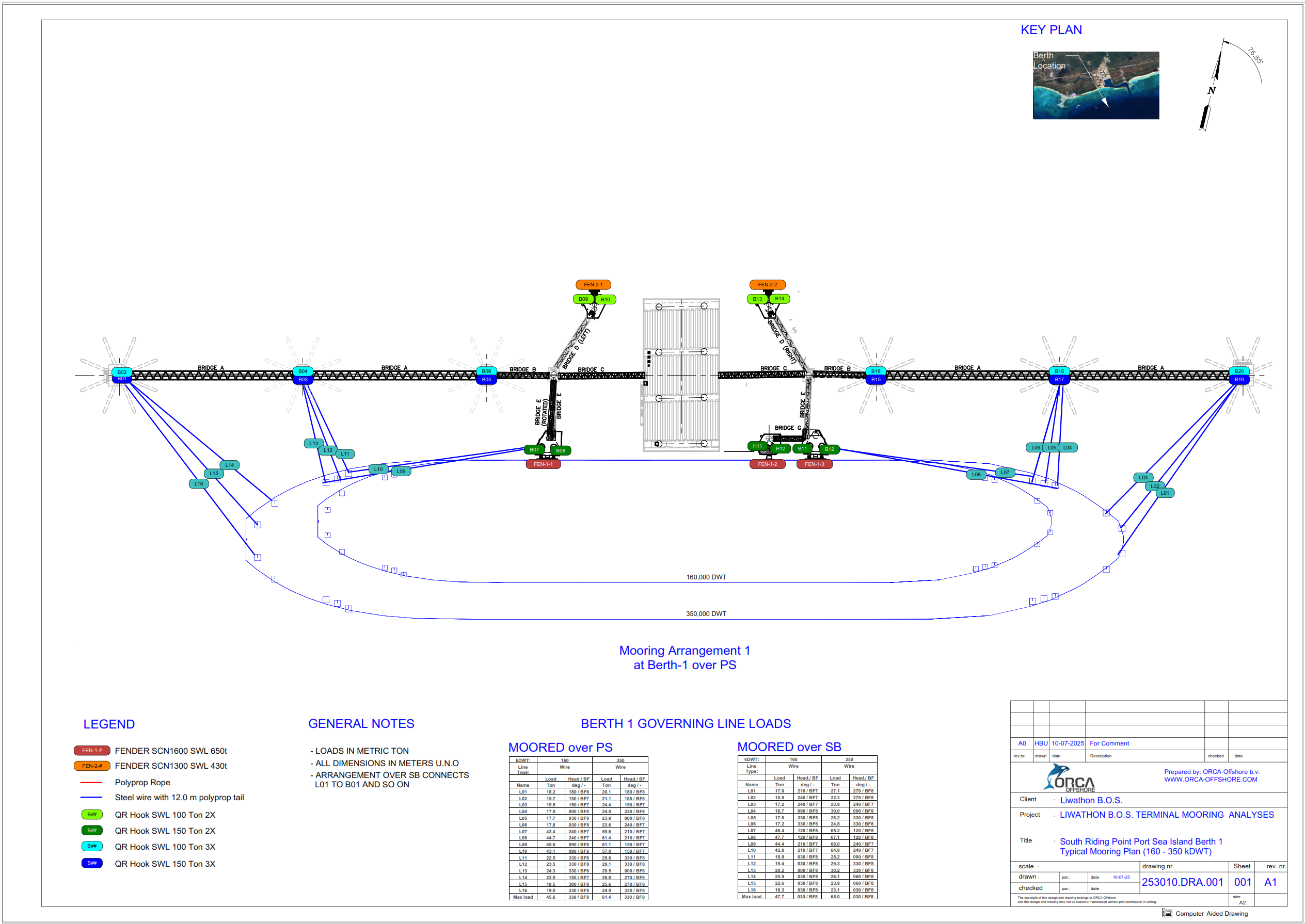 Orca Offshore has worked for the oil terminal owner to perform a generic mooring analysis for a range of vessel from 5,000 to 350,000 Ton DWT for their four terminals at the Bahamas to determine the allowable safe environment for the transfer operation. Two mooring locations are situated offshore while the other two are inshore sheltered in port.